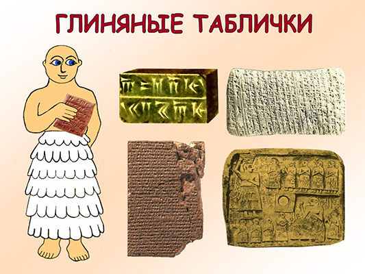 Глина была самым распространенным материалом на территории Месопотамии. Из нее делали кирпичи для строительства храмов, посуду, сельскохозяйственные орудия, даже детские игрушки ведь после обработки огнем глина становилась очень прочным материалом. Обилие глины подсказало шумерам мысль о том, чтобы использовать глину в качестве писчего материала. Это в свою очередь сказалось на характере изображения знаков.